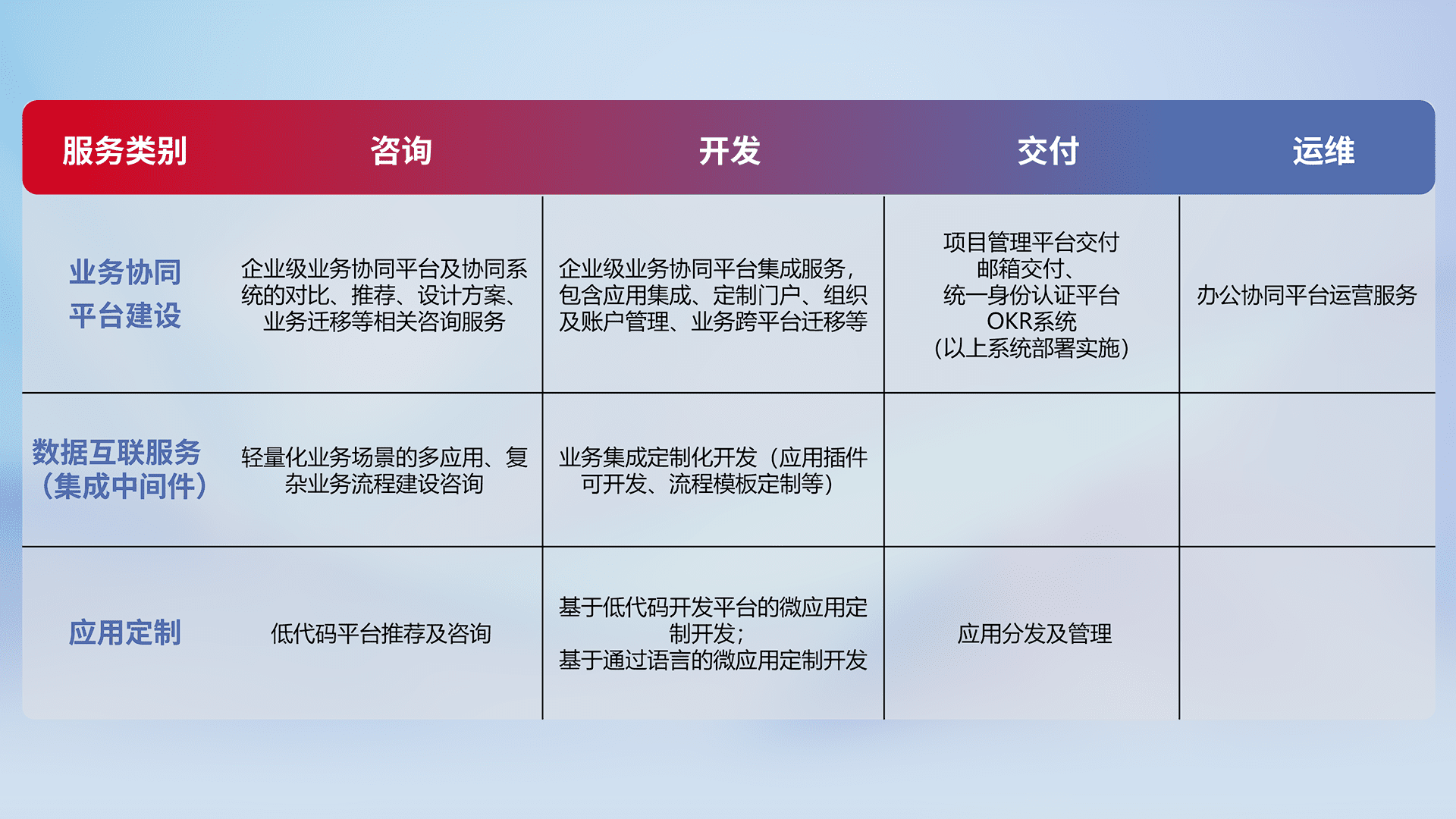 针对钉钉、、企微、、、、IDaas等平台级产品提供产品的规划、、、方案、、、交付、、、、定制化开发等服务,,实现如统一协同办公、、、、智能客户服务、、混合会议管理、、、智能数据查询、、、、等业务场景,,,,实现数字化转型。。