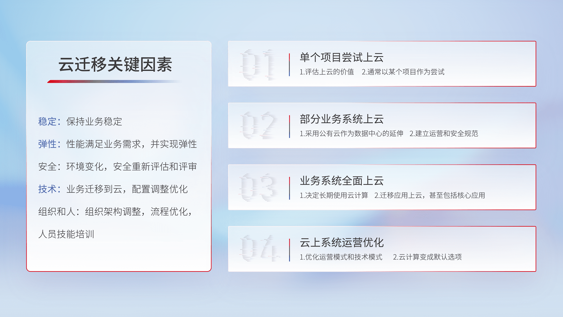 结合实际业务,,从规划设计、、、云平台选型、、、、云原生改造、、、数据迁移、、集成交付,,迁移全过程为客户识别最佳上云路径,,,,做好风险识别管理,,,,设计网络架构、、、、身份权限、、、、安全审计合规、、操作审计、、日志审计、、监控告警策略、、、多站点容灾设计等,,对云上基础设施进行整体规划,,,,提升IT治理水平,,,以满足弹性、、、高可用、、、高性能的需求。。